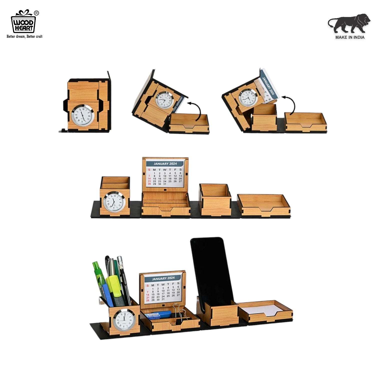 Elevate your workspace with the WoodHeart 5-in-1 Multifunctional Desk Organizer, a perfect blend of utility and elegance. Designed with thoughtful compartments and crafted from high-quality engineered wood, this organizer features a built-in analog clock, a reusable perpetual calendar, dedicated holders for pens, notepads, and a mobile stand β making it an all-in-one solution for organized productivity.