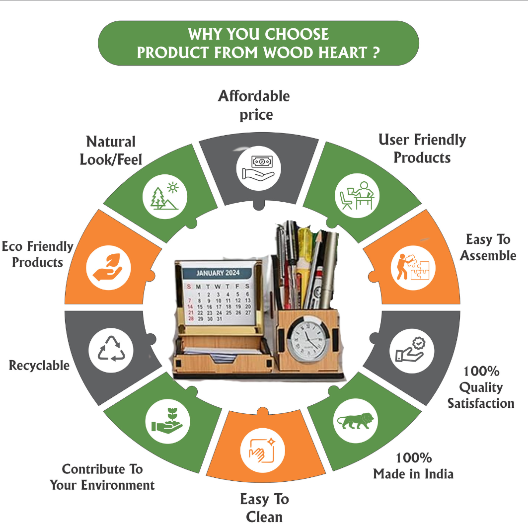 Enhance your workspace with the WoodHeart Dual Utility Desk Organizer, an elegant fusion of design and function. This beautifully crafted wooden set features a pen holder with a built-in analog clock and a detachable calendar stand with a golden frame, making it a perfect desktop companion for home or office. Stay organized, manage time, and add a touch of class to your desk setup.