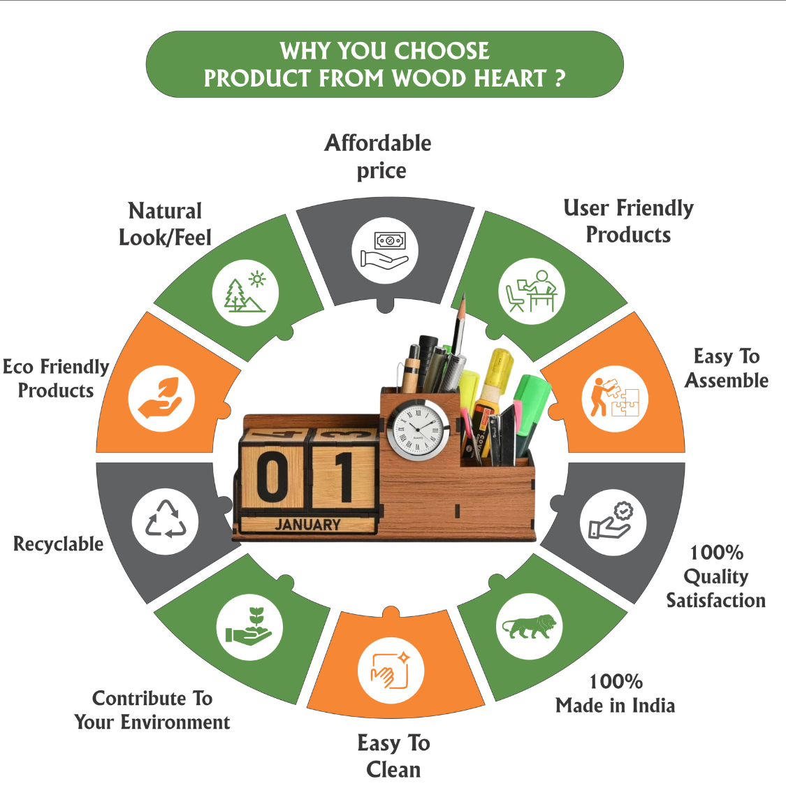 Stay organized with timeless style using the WoodHeart Perpetual Calendar Desk Organizer. This premium multifunctional wooden unit combines a perpetual block calendar, a sleek analog clock, and a spacious pen holder, making it a perfect desk companion for professionals, students, and creatives alike. With its handcrafted elegance and functional design, it brings charm and order to any workspace.